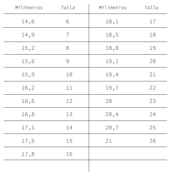 Coge un hilo de coser y colócalo alrededor del dedo. Extiende el hilo sobre una regla y mide la distancia y según los milímetros calcula la talla con esta tabla: