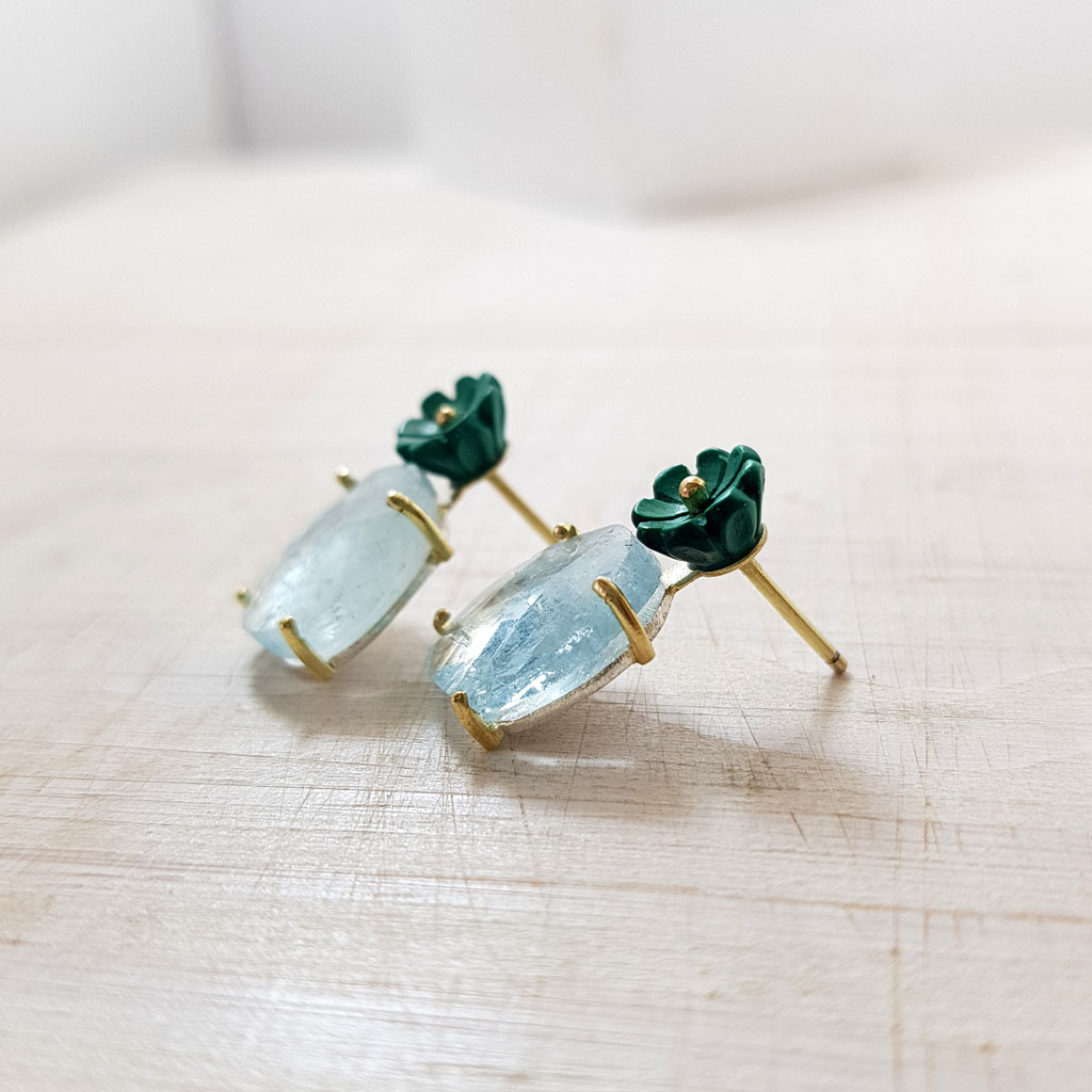 Pendientes de oro amarillo con Piedra Natural Aguamarina. Pendientes Artesanales con cierre presión de Oro. Pendientes con piedra natural Aguamarina ovalada y cierre Oro. P...