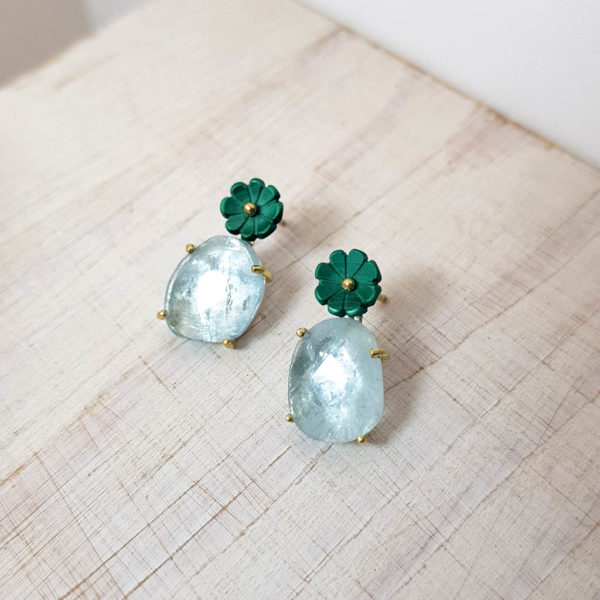 Pendientes de oro amarillo con Piedra Natural Aguamarina. Pendientes Artesanales con cierre presión de Oro. Pendientes con piedra natural Aguamarina ovalada y cierre Oro.